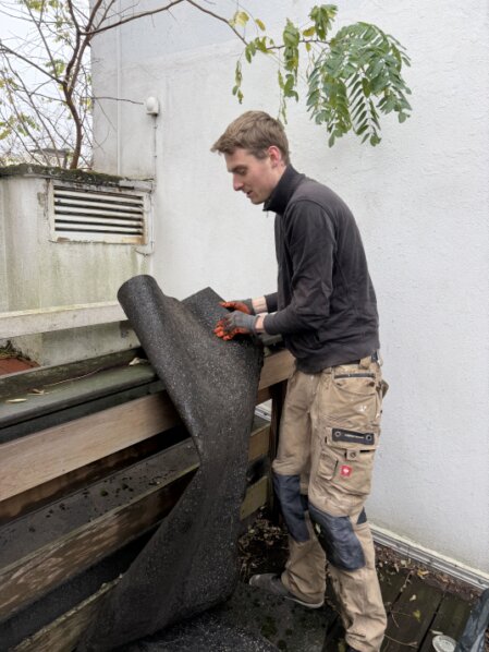 Unter tatkräftiger Unterstützung aller Beteiligten haben wir die Terrasse gründlich von Laub befreit. Die Blätter unter der Terrasse hatten den Ablauf verstopft und sorgten für lästige Pfützen.