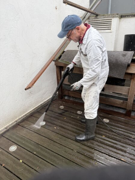Anschließend wurde die gesamte Fläche mit dem Hochdruckreiniger gereinigt, sodass die Terrasse nun wieder wie neu strahlt. Ein kleiner Einsatz mit großem Effekt für unser Clubheim.