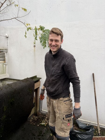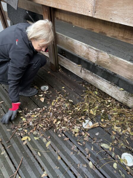 Unter tatkräftiger Unterstützung aller Beteiligten haben wir die Terrasse gründlich von Laub befreit. Die Blätter unter der Terrasse hatten den Ablauf verstopft und sorgten für lästige Pfützen.